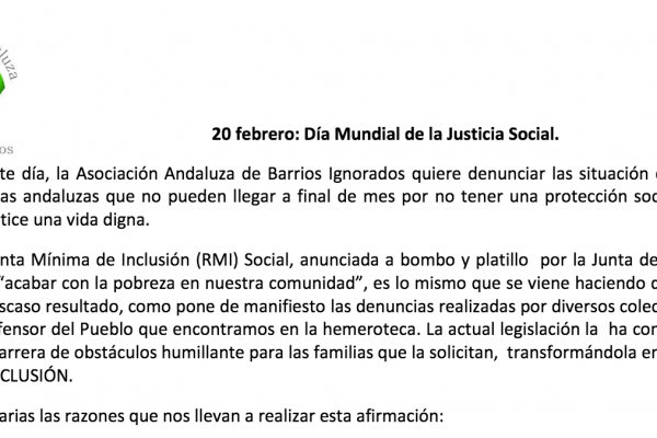 20 febrero: Día Mundial de la Justicia Social En este día, la Asociación Andaluza de Barrios Ignorados quiere denunciar las situación de muchas familias andaluzas que no pueden llegar a final de mes por no tener una protección social que les garantice un a vida digna. La Renta Mínima de Inclusión (RMI) Social, anunciada a bombo y platillo por la Junta de Andalucía para “acabar con la pobreza en nuestra comunidad”, es lo mismo que […]