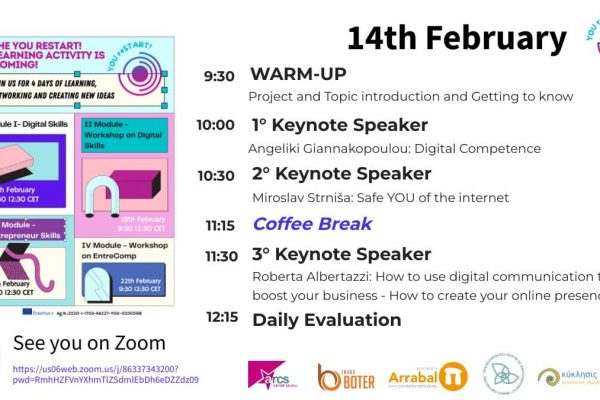 YOU reSTART! proyecto Erasmus+ el cual tiene como misión crear una herencia de habilidades y prácticas compartidas para el desarrollo de la iniciativa empresarial iniciativas en el campo de la cultura y el arte, incluido un uso innovador de la tecnología digital. Para ello ha organizado cuatro sesiones, de manera online y en inglés, con profesionales y experiencias de Italia, Grecia, Bulgaria, Eslovenia y España. Para participar debes inscribirte en ESTE FORMULARIO, indicando si quieres