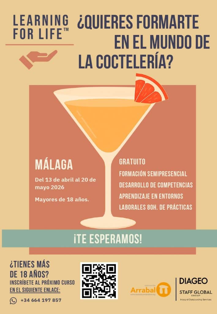 Te ofrecemos una formación en coctelería (bartender) desde Learning for Life de Diageo, que se llevará a cabo entre el 13 de abril y el 20 de mayo en la Asociación Arrabal de Málaga. Está pensada para personas mayores de 18 años que quieran adquirir competencias reales y mejorar su empleabilidad en el sector hostelero.