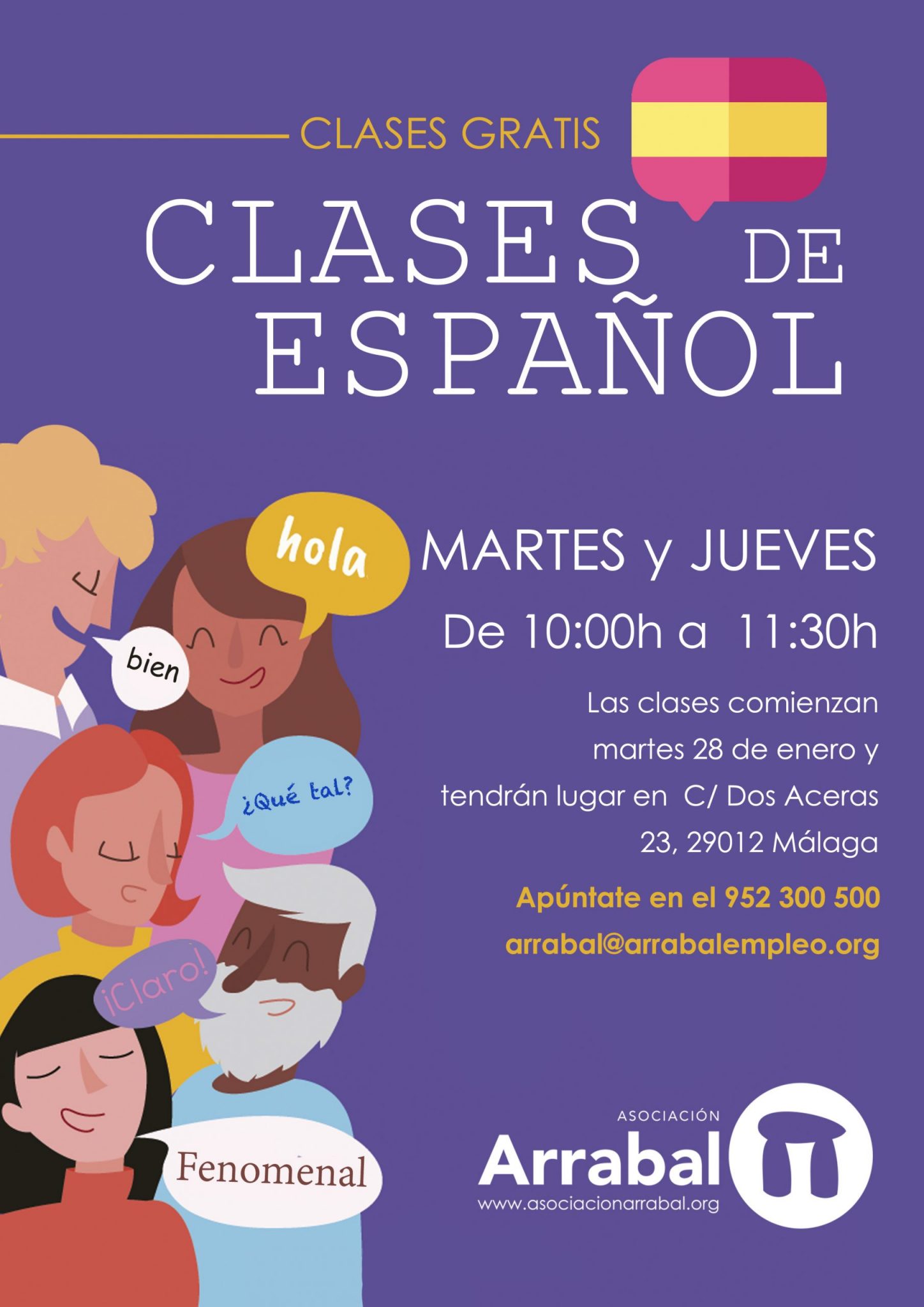 Las clases serán impartidad en Arrabal-AID, en Calle Dos Aceras 23, 29012, Málaga, en horario de 10h a 11:30h los martes y jueves de cada semana. Si estás interesado/a en asistir a las clases debes apuntarte en: